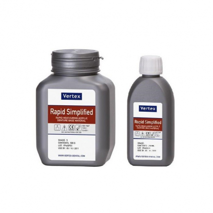 Vertex™ Rapid Simplified – це пластмаса гарячої полімеризації, яка утворює міцну основу для повних та часткових протезів. Техніка натискання є методом обробки для швидкого спрощення. Цей акрил, вільний від кадмію, має швидкий 20-хвилинний цикл полімеризації (також можлива полімеризація протягом ночі). Флягу кладуть у киплячу воду.