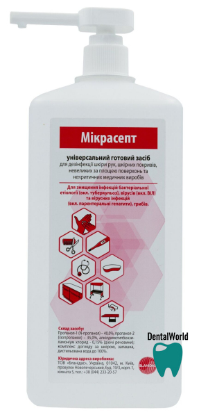 The product is available as a ready-to-use liquid with a characteristic alcoholic odor. The pH level is 5.5 ± 1.5%.Care complex included in the composition of Micrasept disinfector protects hands from dryness and irritation, helps to preserve elasticity and natural water-fat balance of the skin.