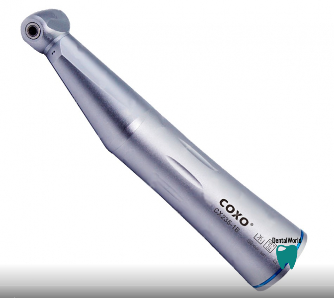 The COXO CX235 C-1B (1:1 gear ratio) direct gear handpiece is designed for use in orthodontic, general and prosthetic dentistry. The handpiece's heat-resistant body is made of lightweight stainless steel and has a silver finish.