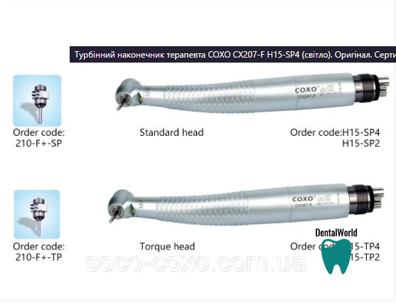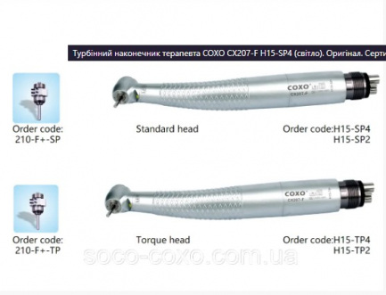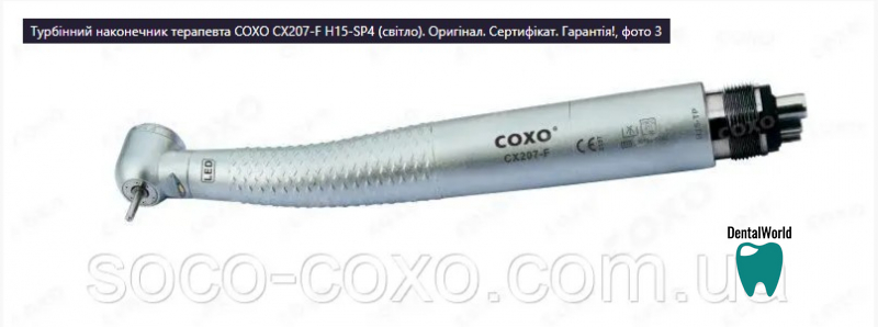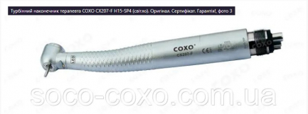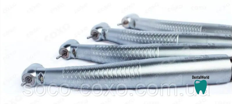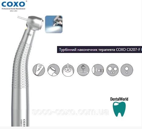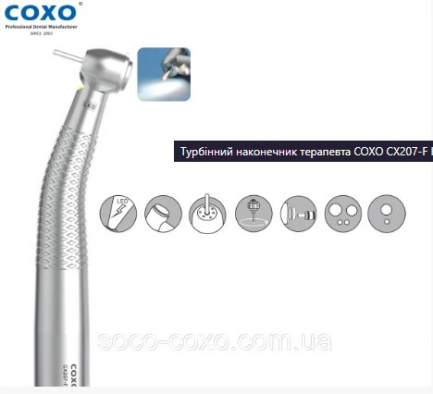 Стоматологічний турбінний наконечник із терапевтичною головкою CX207-F з вбудованим LED генератором світла, німецькими підшипниками від Myonic, потрійним розпилювачем води та повітря, виробництва COXO.