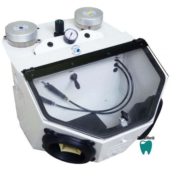 The sandblasting device can be equipped with 1-3 tanks each adjustable depending on the size of sand used (50-80; 90-125 or 150-250 microns.). The sandblasting procedure is controlled by a pneumatic pedal, and the working pressure is regulated by a pressure regulator. The camera is well lit with a 9 W fluorescent lamp and the plexiglass doors are protected by a special letter, which can be easily replaced. 38x57x28 cm., 11 kg.