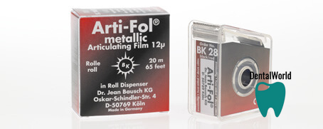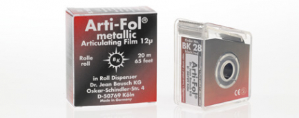 Неповторимая комбинация металлической фольги- продукта высоких технологий (фольга Shimdtock-Folie толщиной 12мкм) - с двусторонним цветопередающим покрытием, содержащим чрезвычайно тонко измельченный цветовой пигмент, способствует отчетливо видимой маркировке любых окклюзий в точках контакта. Новый продукт марки Arti-Fol Metallic BK28 способен также обеспечить точную маркировку даже при увлажненных поверхностях окклюзии. Этот продукт, кроме того, обладает универсальностью по отношению к материалам, которые входят в контакт при окклюзии, будь это металлы и их сплавы, керамика или синтетически созданные материалы, включая композиты, а также, что вполне естественно, природный материал зубов.