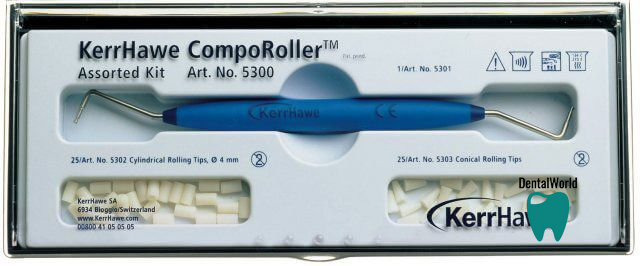 CompoRoller (Компороллер) - новый инструмент для моделирования композитов, предназначенный для обеспечения полного контроля за адаптацией слоев композита и придания реставрациям, изготовленным прямым методом, их конечной формы. Рабочие части инструмента CompoRoller представляют собой запатентованные компанией KerrHawe роликовые насадки, которые не липнут к материалу и обеспечивают созданиегомогенных слоев любого композита без образования воздушных пузырьков. Существует 7 видов насадок для Comporoller: