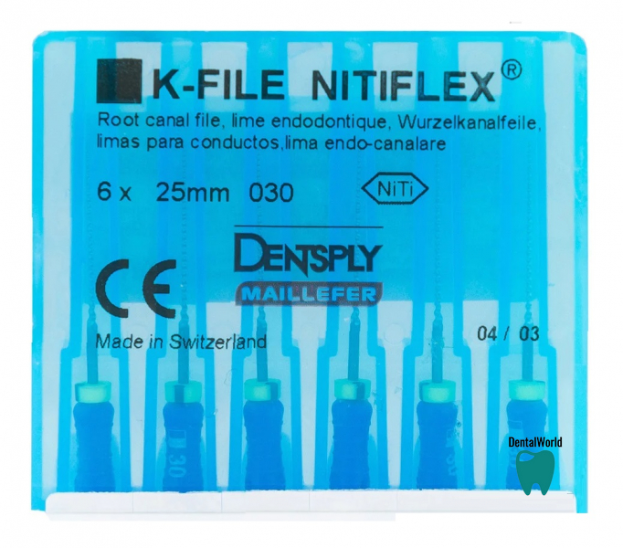 K-File Nitiflex (К-Файл Нитифлекс) - ручной эндодонтический инструмент для расширения корневого канала и удаления содержимого из него, изготовлен из никель-титанового сплава методом вытачивания, с увеличенной прочностью и эластичностью.