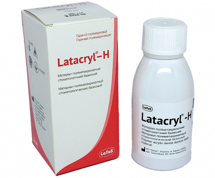 Latacryl-L представляет собой композицию, которая готовится непосредственно перед применением из тонкодисперсного окрашенного в оттенок розового цвета порошка суспензионного полиэтилметакрилата и жидкости, окрашенной в розовый цвет, не содержащей метилметакриалата.