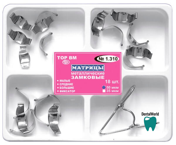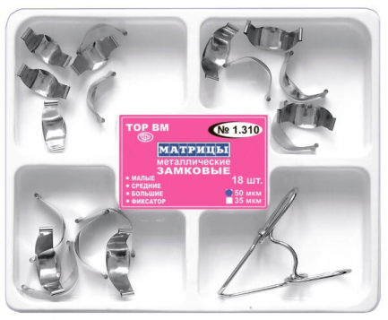 Матрицы металлические замковые выпускаются плоские и контурные. Края матриц выполнены в виде цилиндрических трубочек, в которые вставляют ножки кольца № 1.033 или фиксаторов замыкающих № 1.003 иди № 1.005. Матрицы изготавливают из специальной коррозионностойкой стали.