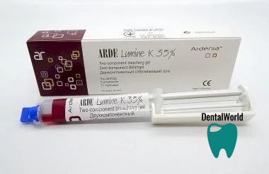 Arde Lumine K 35% є системою для office whitening. Це є сирінг з двома компонентами гель-like, що спирається на hydrogen peroxide (35%). Двохкомпонентів біління gel є активним після змішування компонентів і може функціонувати безактивації за світлом. Якщо можливий, photolamp є також використаний для збільшення ефекту. Можливість біління без ultraviolet irradiation makes material universal. Professional whitening gel Arde Lumine K є пристосований для intracanal whitening depulped teeth. З Arde Lumine K 35%, excelent результати є achieved. Двохкомпонентний 5 g automix syringe ensures proportional mixing, rational use and easy handling.
