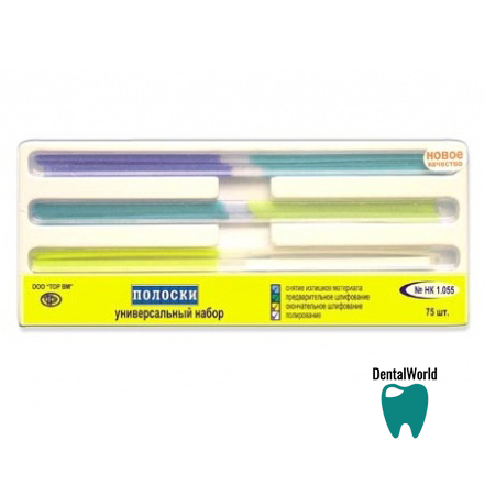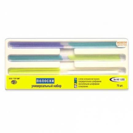 Полоски 1.055 шлифовальные универсальные набор, 75 шт. на лавсановой основе. Каждая полоска имеет 2 участка с различной абразивностью, цветокодированные. Универсальный набор. Состоит из полосок № НК1.050 - для снятия излишков материала, цвет синий/зеленый - 25 шт, № НК1.051 - для предварительного шлифования, цвет зеленый/желтый - 25 шт. №НК1.052 - для окончательного шлифования, цвет желтый/белый - 25шт.