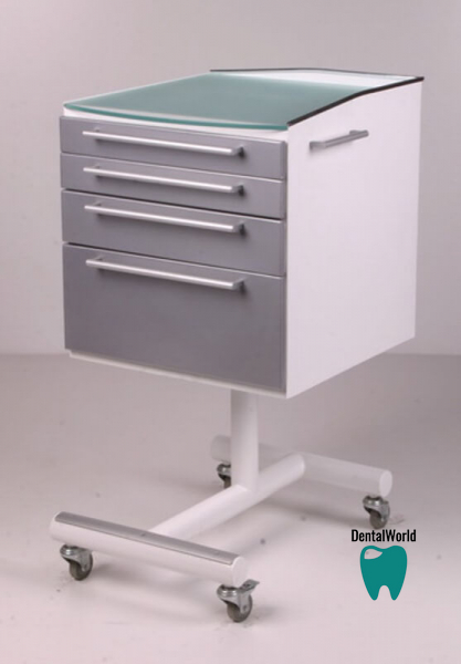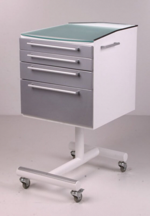 Удобная мобильная тумба среднего размера (450х450мм), с выдвижными ящиками и стеклянной столешницей.