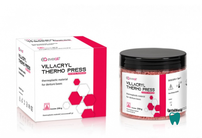 Villacryl Thermo Press – це термопластичний матеріал на основі поліаміду. Він призначений для виготовлення знімних зубних протезів, а саме: повних і часткових протезів, мікропротезів, а також ретенційних елементів каркаса бюгельного протезу, ретенційних шин та утримувачів простору.
